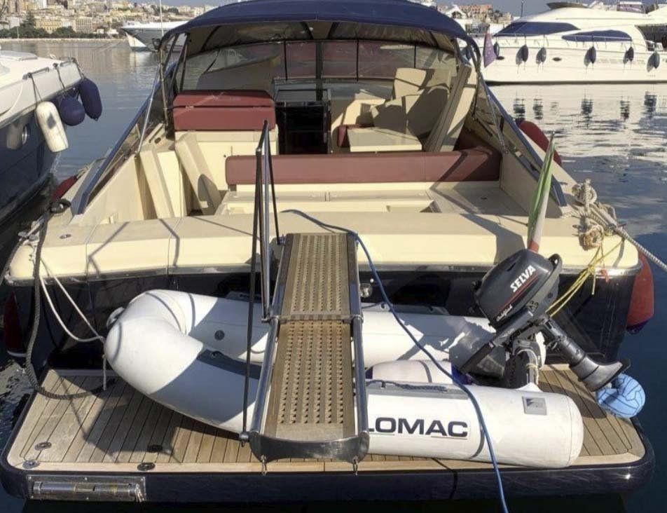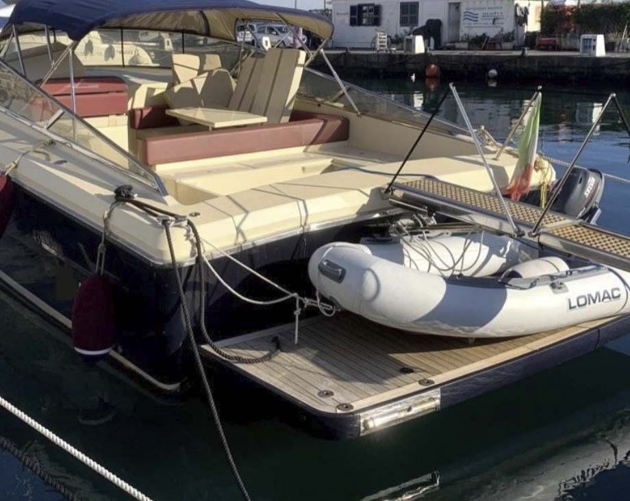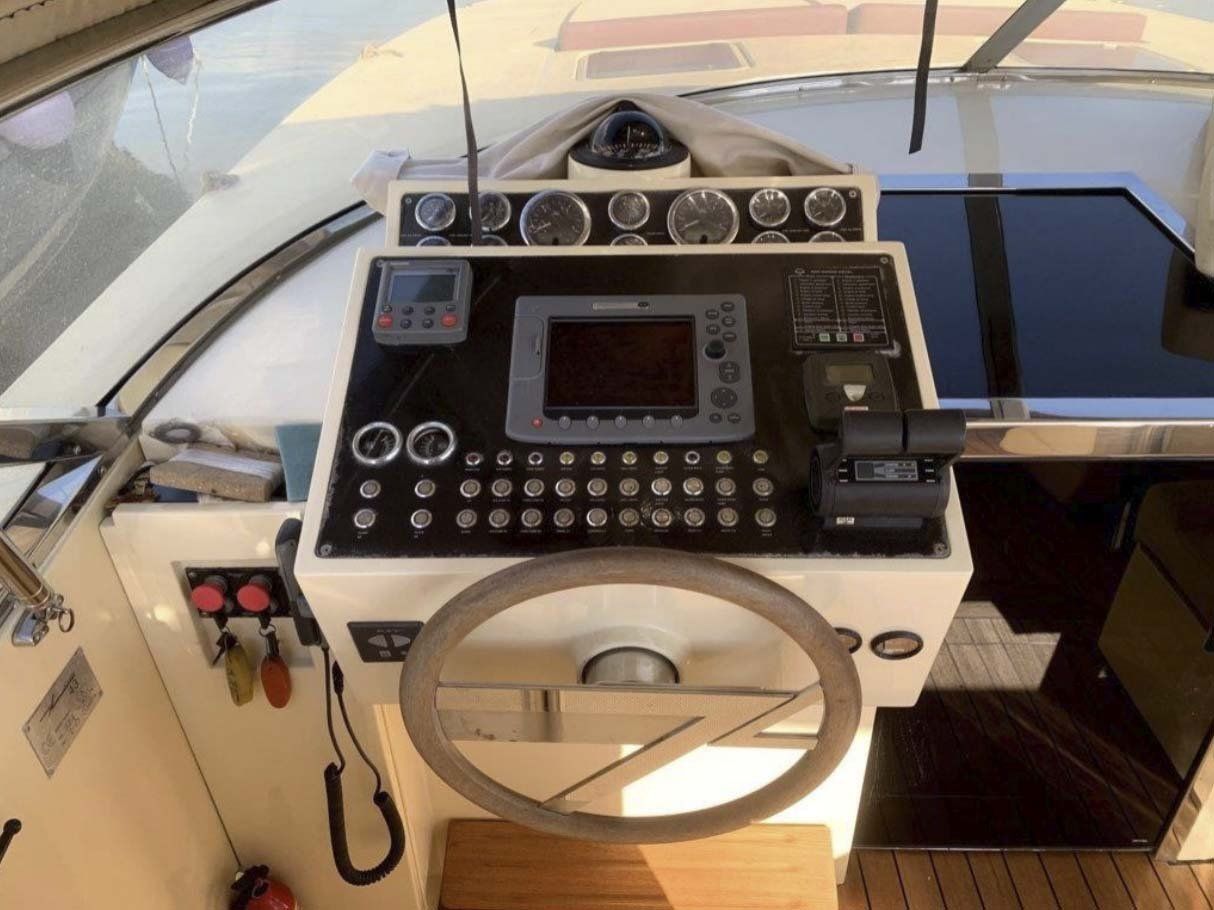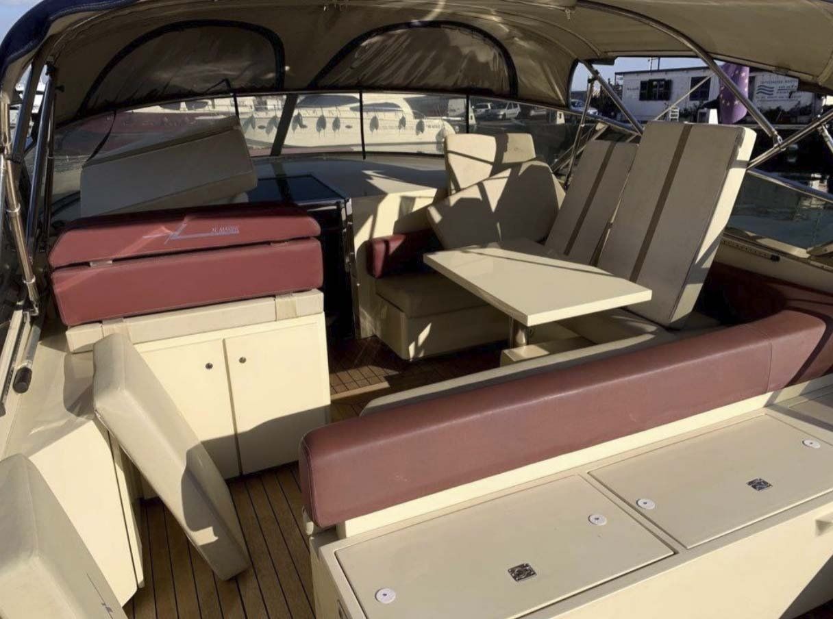 Interni in teak satinato, cielini rivestiti in sky bianco, dinette convertibile in matrimoniale con divano, cucina con top in acciaio, 1 cabina con bagno privato e 1 cabina ospiti con bagno annesso.